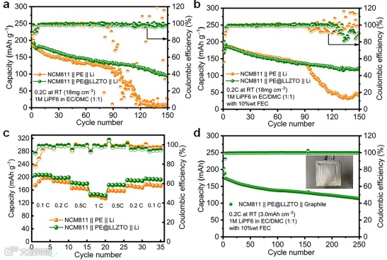 图5. (a) 使用常规电解液在0.2 C下的全电池循环性能和 (b)添加FEC添加剂后在0.2 C下的全电池循环性能, (c) 倍率性能, (d) 使用PE@LLZTO膜的软包电的循环性能.
