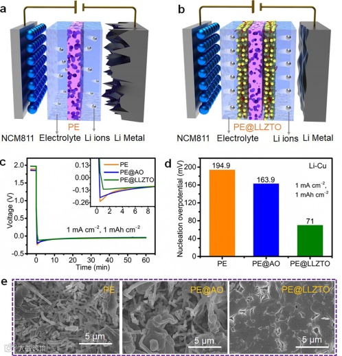 图3. (a, b) 锂离子通过PE与PE@LLZTO膜的传输示意图, (c) PE,PE@AO和PE@LLZTO三种膜的锂铜电池中锂沉积电位变化曲线和 (d) 三种膜的成核过电位数值, (e) 以及使用三种膜锂沉积在铜箔上的形貌图.