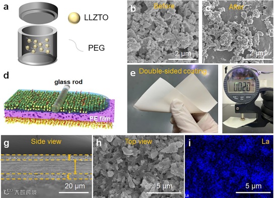 图1. (a) 湿法球磨共混示意图, (b) 球磨前LLZTO颗粒形貌, (c) 球磨后LLZTO颗粒形貌, (d) 双面涂覆示意图, (e) PE@LLZTO双面涂覆膜实物图, (f) PE@LLZTO膜的厚度, (g) PE@LLZTO膜的截面SEM图, (h) PE@LLZTO膜表面的SEM图, (i) PE@LLZTO膜表面La元素的EDX图谱.