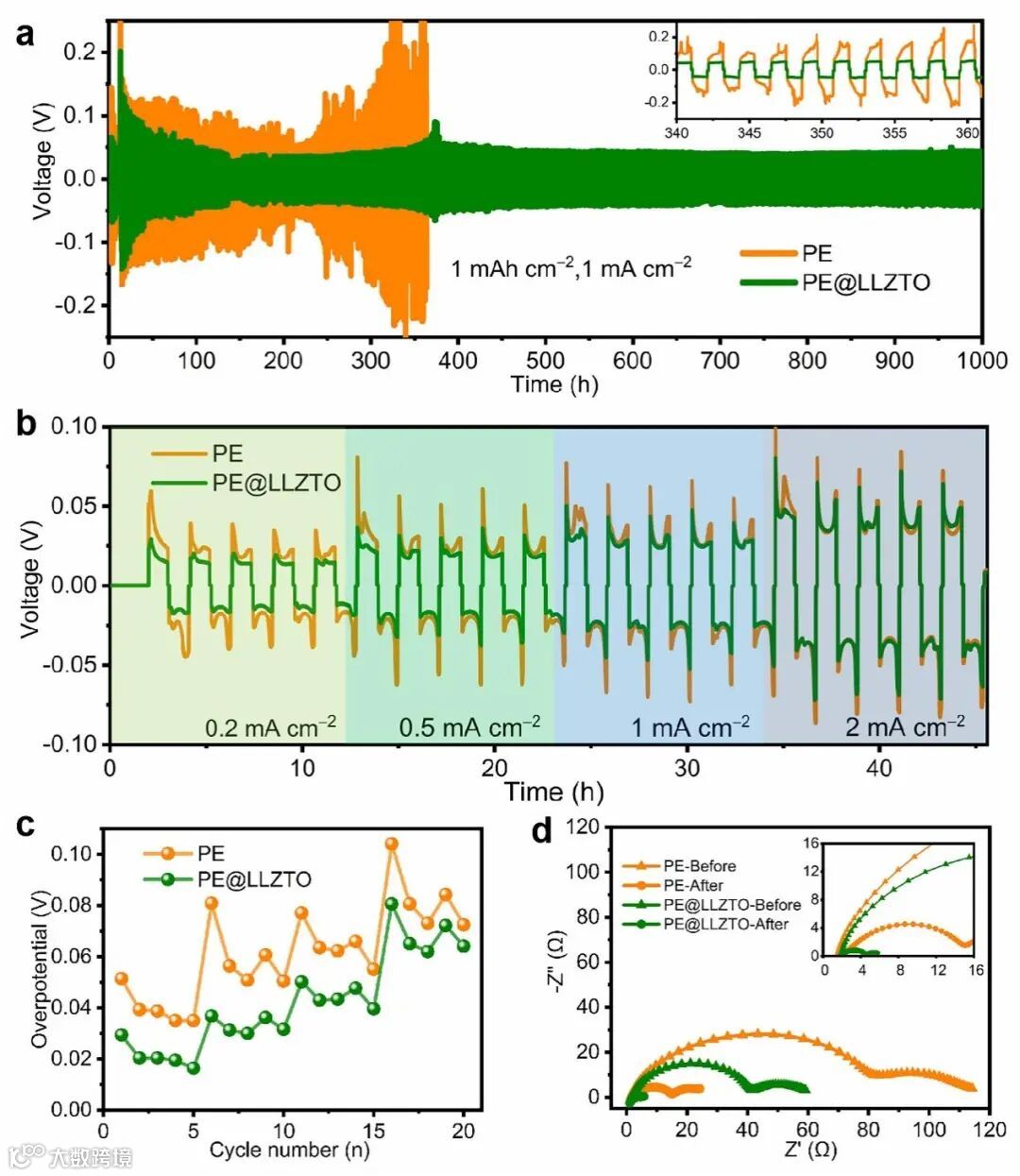 图4. (a) PE和PE@LLZTO膜的锂对称电池循环性能, (b) 电流密度从0.2增大至 2.0 mA cm- 2时, PE和PE@LLZTO膜的锂对称电池的电压波动图和 (c) 相关过电位, (d) 以及两种膜在锂对称电池中循环前的阻抗谱.