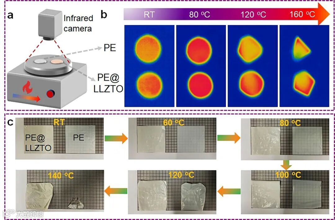 图2. (a) 红外热成像装置示意图, (b) PE与PE@LLZTO膜在加热台上室温到160度实时红外热成像图, (c) PE与PE@LLZTO膜在恒温烘箱保持不同加热温度后的热收缩照片.