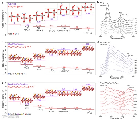 图4 OER活性机理分析。a RuO2的吉布斯自由能图;b RuO2的原位ATR-SEIRAS光谱;c Ba0.4(SO4)δRu0.6O2−δ的吉布斯自由能图;d (SO4)δRuO2−δ的原位ATR-SEIRAS光谱;e Ba0.3(SO4)δW0.2Ru0.5O2−δ的吉布斯自由能图;f Ba0.3(SO4)δW0.2Ru0.5O2−δ的原位ATR-SEIRAS光谱;