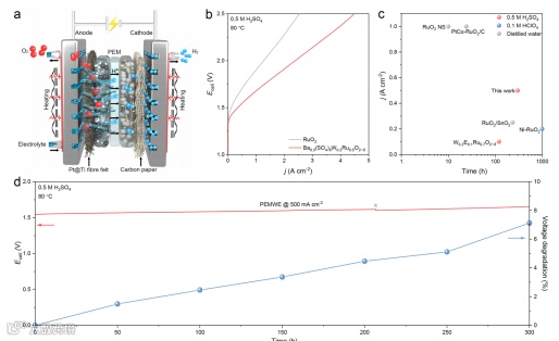图6 PEMWE测试。a PEMWE示意图;b PEMWE极化曲线;c PEMWE稳定性汇总;d 0.5 M H2SO4中PEMWE的稳定性曲线。