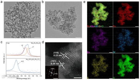 图2 催化剂的制备和表征。a Ba0.3W0.2Ru0.5Sx的TEM图;b Ba0.3(SO4)δW0.2Ru0.5O2−δ的TEM图;c Ba0.3W0.2Ru0.5Sx和Ba0.3(SO4)δW0.2Ru0.5O2−δ的S 2p XPS光谱;d HAADF–STEM图;e EDS mapping图。