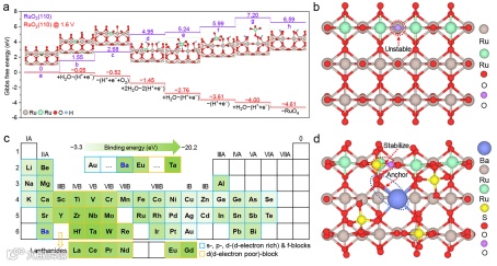 图1 DFT指导RuO2稳定性策略。a RuO2(110)晶面中Ru原子溶解的理论计算吉布斯自由能图;b RuO2(110)晶面球棍模型;c RuO2(110)晶面上各种金属元素与硫酸盐的结合能分布图;d Ba将硫酸盐锚定在RuO2(110)晶面的球棍模型。