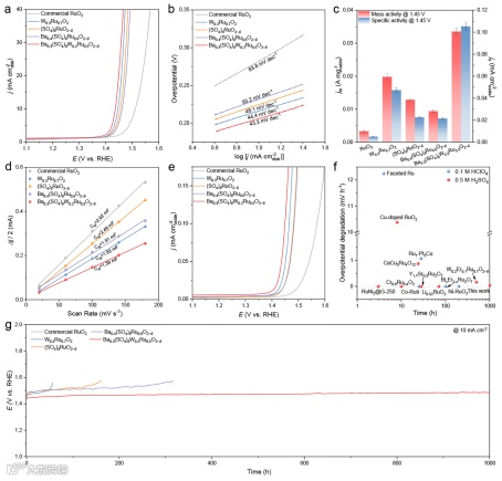 该研究提出了一种含氧阴离子保护机制。研究团队通过筛选出Ba锚定的硫酸盐来抑制晶格O的过度氧化。与此同时,通过W的引入降低了催化剂的反应过电位。这两者的综合作用有效提高了Ru基催化剂的酸性OER稳定性。这一研究为设计高稳定性催化剂提供了一种全新的视角和策略。