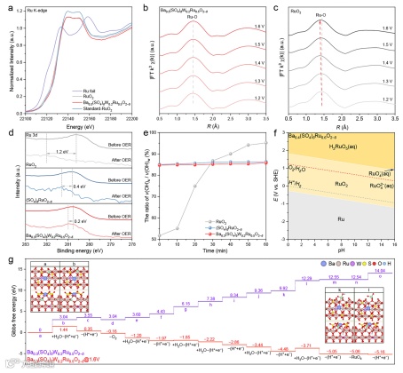 图5 催化剂稳定性机理分析。a Ru K-edge XANES光谱;b Ba0.3(SO4)δW0.2Ru0.5O2−δ的原位EXAFS光谱;c RuO2的原位EXAFS光谱;d OER测试前后Ru 3d XPS光谱;e 原位ATR-SEIRAS光谱中v(OH)s / v(OH)w强度图;f Ru元素的Pourbaix图;g Ba0.3(SO4)δW0.2Ru0.5O2−δ中Ru原子溶解的理论计算吉布斯自由能图。