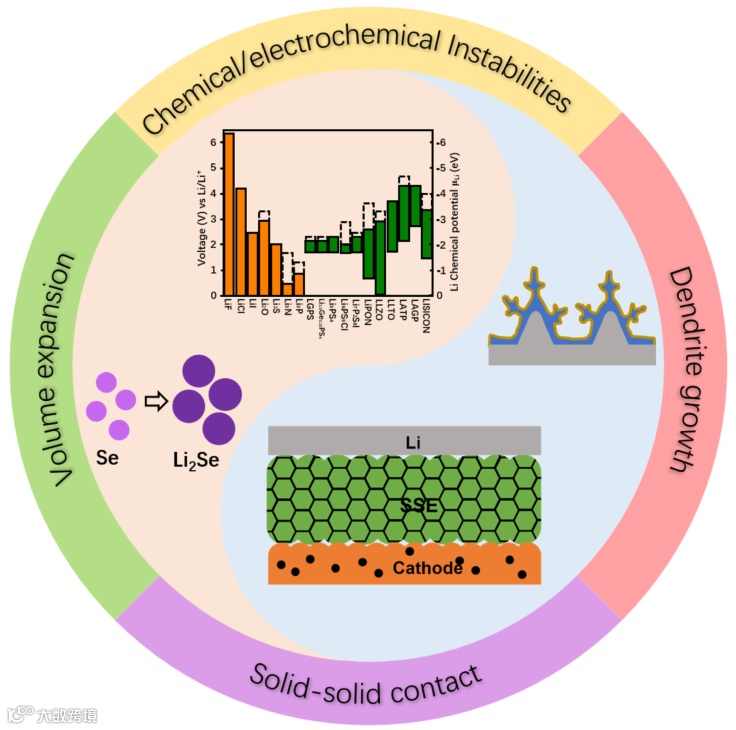 由于金属Li电化学电位极低(-3.04 V vs. Li+/Li),在Li/SSEs界面处容易发生化学/电化学反应,并产生有害的副产物,影响固态锂硒电池的电化学性能。另外,在剥离过程中容易产生锂空位导致界面接触损失,从而引起局部电流密度升高,致使在随后的沉积过程中形成锂枝晶。当然,Li/SSEs差的界面润湿性和界面化学/电化学稳定性也会诱导锂枝晶的生长,最终导致电池失效。目前,针对该问题,已经提出多种策略应对,例如,合金负极和稳定SEI层的构建,3D锂结构的构建以及外部压力的施加等。