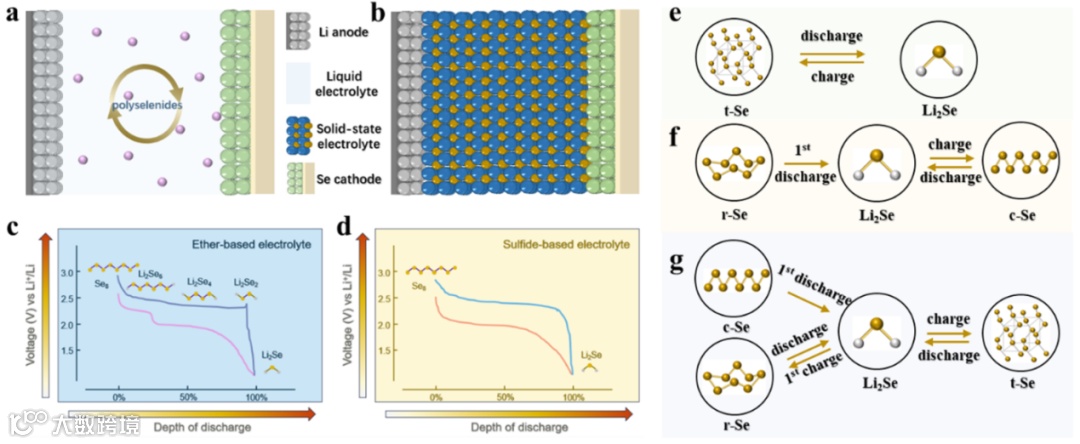 图1. 液态与固态锂硒电池充放电电化学行为对比示意图