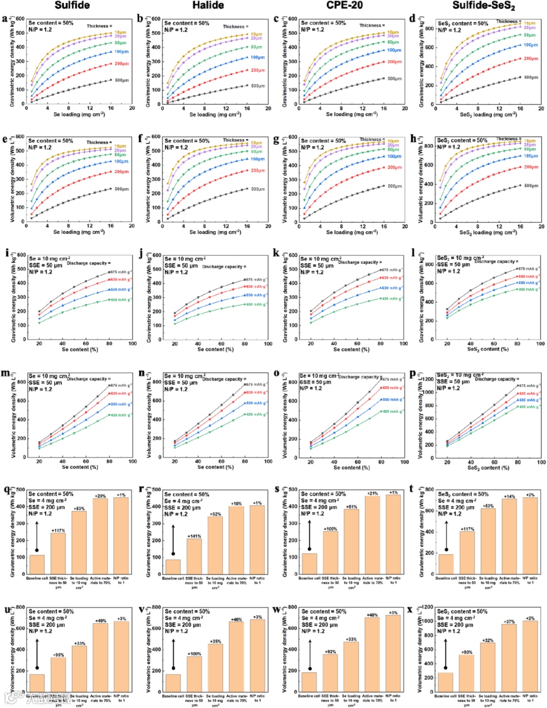 图4. 基于硫化物、卤化物和混合电解质(CPE-20)固态锂硒电池实际重量和体积能量密度的估算