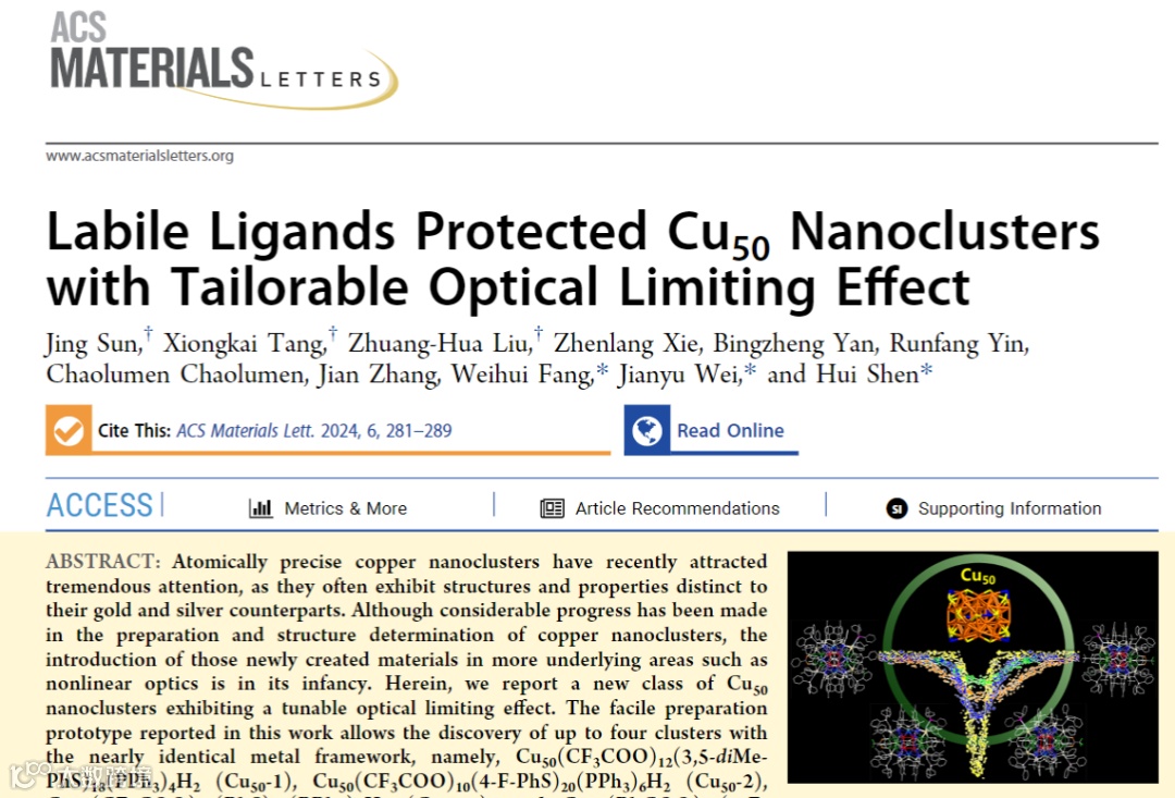 近日,内蒙古大学沈慧教授在国际著名期刊ACS Materials Letters 上发表题为“Labile Ligands Protected Cu50 Nanoclusters with Tailorable Optical Limiting Effect”的研究论文。该工作通过一锅合成法制备了四种配体不同相同内核结构的Cu50 纳米团簇,分别为Cu50(CF3COO)12(3,5-diMe-PhS)18(PPh3)4H2 (Cu50-1), Cu50(CF3COO)10(4-F-PhS)20(PPh3)6H2 (Cu50-2), Cu50(CF3COO)10(PhS)20(PPh3)6H2 (Cu50-3) and Cu50(PhCOO)10(4-F-PhS)20(PPh3)6H2 (Cu50-4)。该工作向我们展示,相同铜原子内核构成的四个纳米团簇,其表面配体可以调控NLO特性,使得铜团簇在非线性光学领域的应用产生可能。这项工作不仅报道了一类新的制备简单、结构清晰、表面可调的原子精确的铜纳米团簇,而且鼓励了读者对铜纳米团簇在更多应用方向的研究。