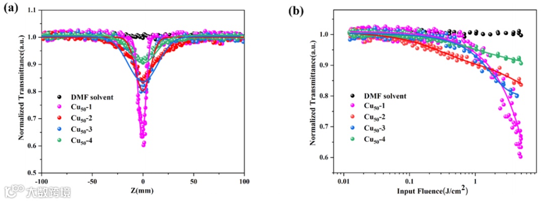 图3 Cu50系列团簇的(a) OA z扫描曲线和(b) OL曲线。