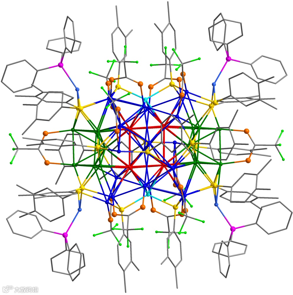 Cu50系列纳米团簇采用一锅法合成,由酸配体、硫醇配体和膦配体共同保护(图1)。值得注意的是,获得四个团簇只需要改变铜盐及硫醇的种类,合成方法相同。以Cu50-1为例剖析内核结构,50个铜原子分为两类,其中44个原子聚集在一起,形成一个多面体结构的金属核(图2)。其他6个铜原子位于Cu44核的外侧,形成金属配体壳层。