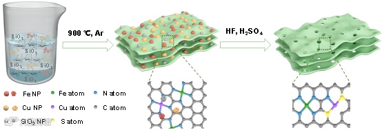 新型双功能催化剂的制备是利用具有-OH和-NH2基团的羧甲基壳聚糖(CTS)链为原料,该链可以在碱性溶液环境中与不同的金属离子(如Fe2+和Cu2+)配位。三聚氰胺辅助制备的Fe2+/Cu2+-CTS-SiO2前体的进一步热解导致形成高度分散的Fe/Cu单原子和共嵌入碳框架中的含Fe/Cu纳米颗粒。再分别使用氢氟酸(HF)溶液蚀刻SiO2硬模板和浓H2SO4溶液去除含Fe/Cu的纳米颗粒。除此之外,浓H2SO4溶液作为硫源,在高温下得到含硫官能团(-SO3H和-SH),为构建非对称Cu-N1S2位点提供条件。