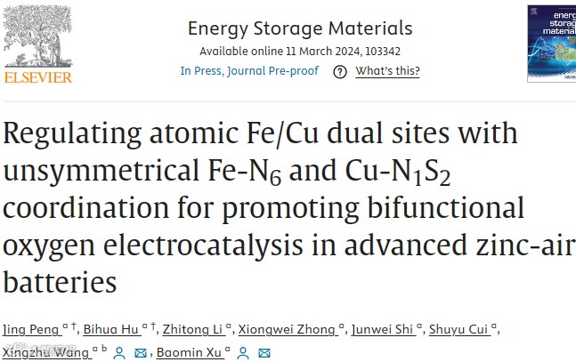 近日,来自南方科技大学的王行柱教授与徐保民教授合作,在国际知名期刊Energy Storage Materials上发表题为“Regulating atomic Fe/Cu dual sites with unsymmetrical Fe-N6 and Cu-N1S2 coordination for promoting bifunctional oxygen electrocatalysis in advanced zinc-air batteries”的观点文章。该观点文章提供了一种非对称双单原子催化剂的制备方法,并在锌空气电池中获得良好的性能。