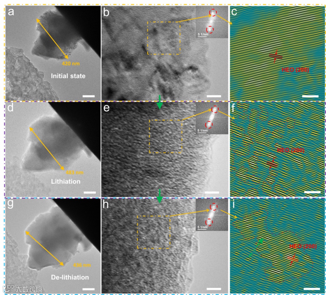 图3 锂化过程中HEO粒子的形态演变。(a)初始态,(d)锂化态,(g)去锂化态,刻度尺为100纳米。HRTEM图像分别对应(b)初始状态,(e)氧化态,(h)去氧化态。比例尺为5纳米。(c, f, i)对应的IFFT和着色图像。比例尺为2纳米