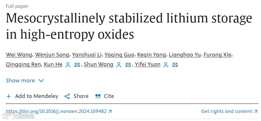 近日,来自温州大学何坤、袁一斐、王舜团队的研究通过最先进的原位表征技术,探索了一种具有代表性的HEO负极-岩盐结构Mg0.2Co0.2Ni0.2Cu0.2Zn0.2O的工作机制。该成果以“Mesocrystallinely stabilized lithium storage in high-entropy oxides”为题发表在国际知名期刊Nano Energy上。该文章从结构和组成上都进行了深入探索来分析具有岩盐结构的高熵氧化物作为锂离子电池负极出色的储锂能力和高循环耐久性。