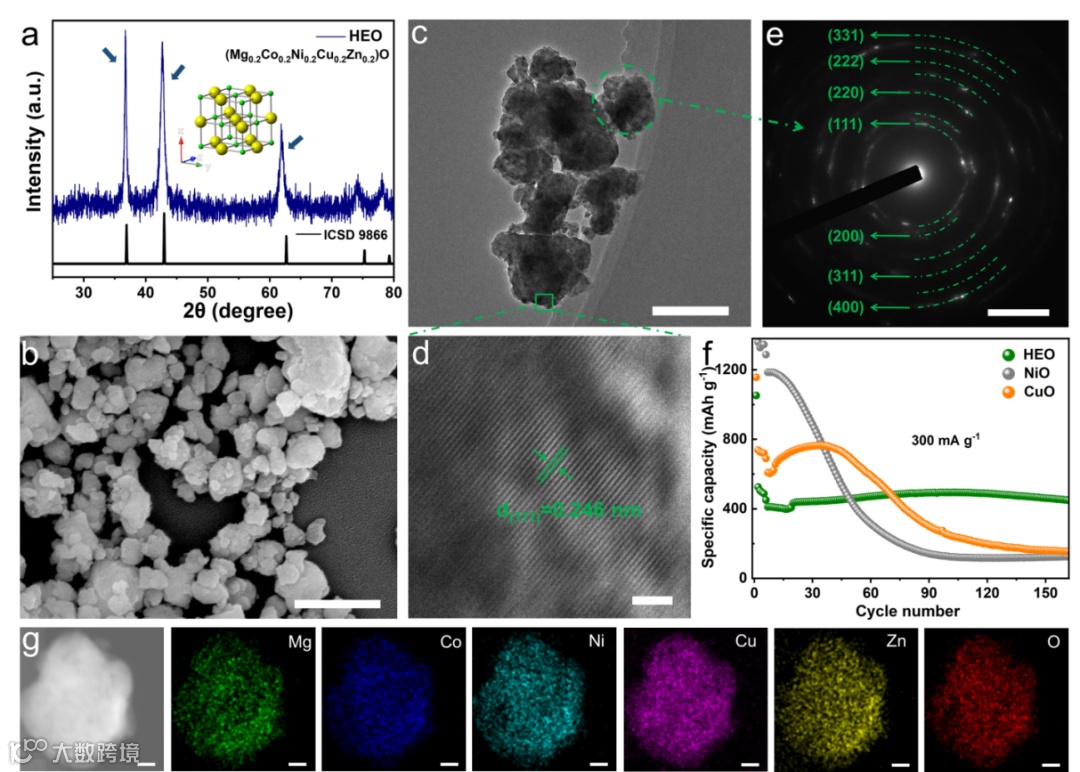 图1 (a)HEO的XRD谱图和插入图(岩盐结构的晶体模型)。绿色球体代表氧阴离子占据的八面体晶格位,黄色球体代表金属阳离子(Mg2+、Co2+、Ni2+、Cu2+、Zn2+)以相同概率随机占据的阳离子位。(b) HEO颗粒形貌的SEM图像。比例尺为500纳米。(c)一个大HEO粒子被许多小HEO粒子包围的TEM图像。比例尺为200纳米。(d) HEO的HRTEM图像。比例尺为2纳米。(e) HEO多晶结构的SAED。比例尺为5 1/nm。(f) HEO、代表性NiO和CuO对比样品在300 mA g-1下的循环性能。(g) HAADF-STEM图像和STEM-EDS元素分布。比例尺为30纳米。