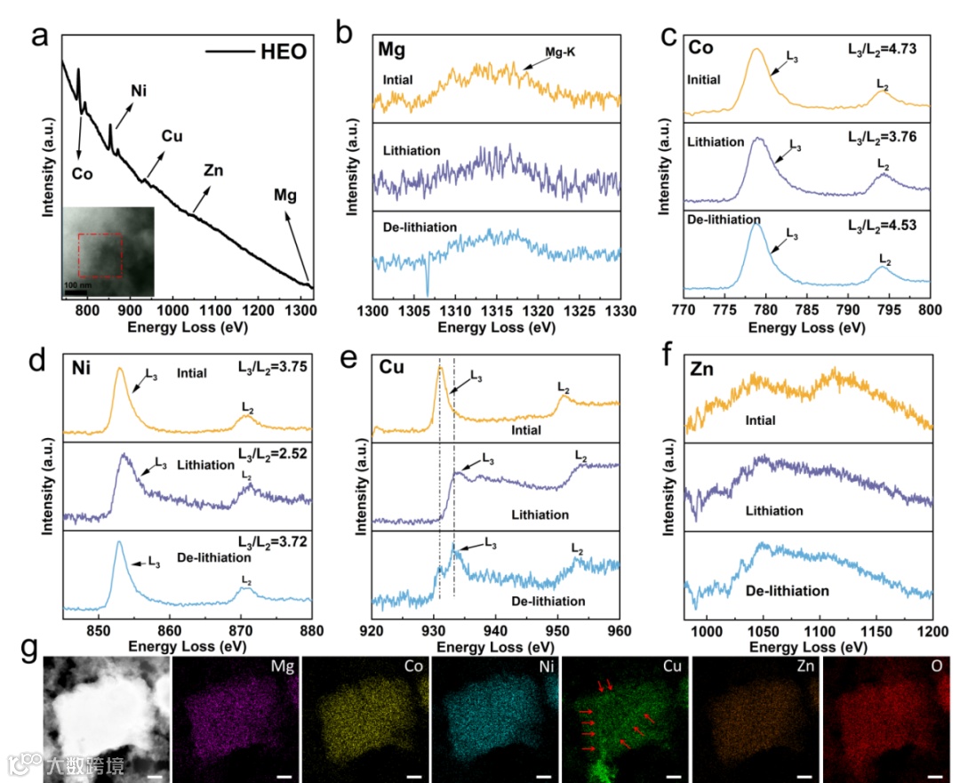 图4 (a) HEO完全锂化后的EELS全谱。从HEO电极上记录了(b) Mg, (c) Co, (d) Ni, (e) Cu和(f) Zn在锂离子和去锂离子循环过程中的EELS光谱。(g)一个循环后HEO负极材料完全脱锂状态的STEM-EDS。比例尺为200纳米。