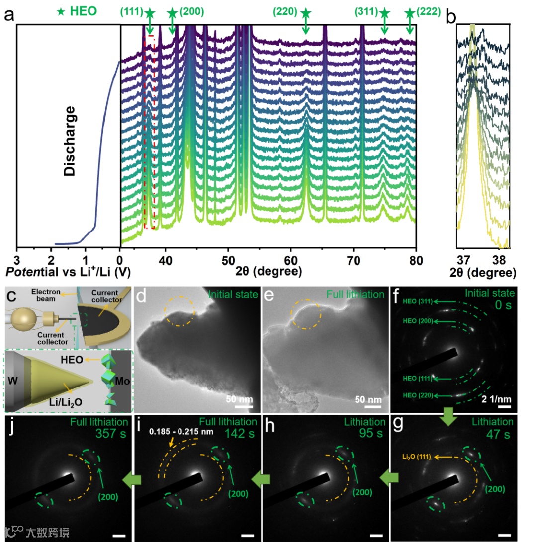 图2 (a)第一个完整锂化周期的原位XRD图,左侧为对应的电位曲线;绿色星对应HEO的特征衍射峰,其余衍射峰为Be和BeO;(b) 对应(a)中红色虚线矩形围成区域放大剖面图;(c)原位TEM实验装置示意图;(d, e)同一HEO纳米颗粒的固定区域,用于原位电子衍射分析;(f-j) HEO粒子第一次锂化过程中SAED图案的演变,完全锂化后HEO晶面仍然保留,并且Li2O作为生成产物出现。