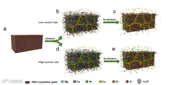 图6 HEO晶体在锂化/脱锂过程中的微观结构演化示意图;(a)电池循环前,Mg, Co, Ni, Cu, Zn原子随机分布在HEO基体中;(b、d)在锂化过程中Co、Ni、Cu、Zn从HEO基体中被还原,而Mg2+保持在氧阴离子晶格中,以保持HEO的结构稳定性;(b-c)在较低电流时,只有Cu0参与导电网络的形成,(d-e)而在较大电流时,Cu0和Ni0都失去了电化学可逆性,形成了导电网络。