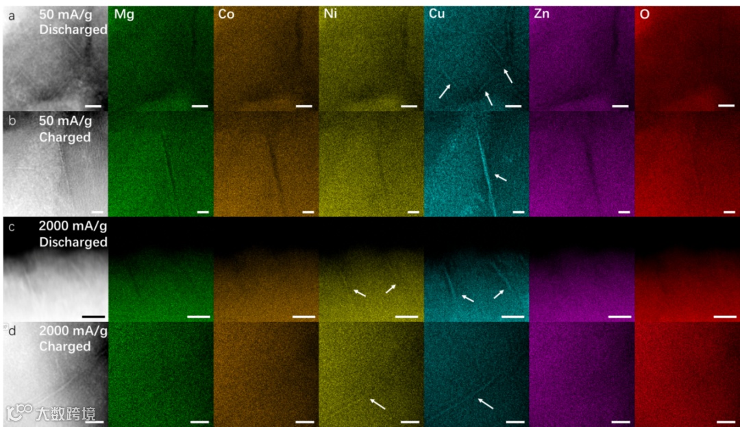 图5 (a-b) 50mA g-1和(c-d) 2000mA g-1电流密度循环HEO负极的STEM-EDS图像,其中b, d为完全充电状态,a, c为完全放电状态。比例尺为20nm。