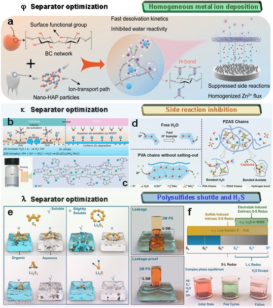 图10. HB化学在隔膜的作用总结。(a) HB隔膜抑制了金属枝晶的生长。经许可转载。[90]威利版权所有2023(b) HB隔膜加速脱溶过程。(c) HB隔膜抑制Zn负极腐蚀。(e)硫基材料在SOB和SABs中的溶解度以及相应的可溶性短链多硫化物穿梭和化学交叉示意图。(f) S−L/S−S路线的代表性氧化还原和H2S气体析出的副反应。