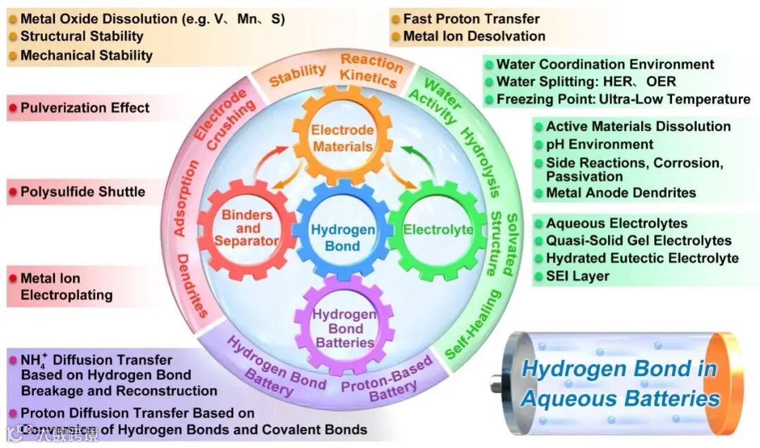 水系电池由于组装简单、安全性好、成本效益高,水系电池正成为大规模电网储能的有力竞争者。然而,独特的含水环境带来了一系列持续的挑战,阻碍了水系电池的进一步发展。这些挑战包括不稳定的金属负极和电极材料,实际应用的电化学稳定窗口(ESW)有限,以及低温条件下的电化学性能较差。这些问题都可以追溯到一个关键因素,即水系电池中的氢键(HB)化学。根据路易斯酸碱理论,H2O分子作为HB的基本组分,同时作为氢键供体(HBD)和受体(HBA)。因此,HB化学可以通过调整电荷分布、稳定晶体结构、抑制材料溶解、防止材料粉碎和加速扩散动力学对电极材料产生深远的影响。因此,全面了解HB化学的功能,并对电极材料和电解质中的HB环境实施有效的法规,对于实现优质的水系电池具有重要意义。