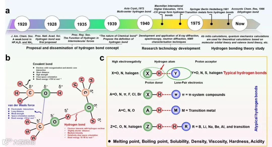 图2. HB概念发展总结。(a) HB发展时间表。(b) HB、共价键和范德华力之间的差异。(c)不同类型的HB及其组成。