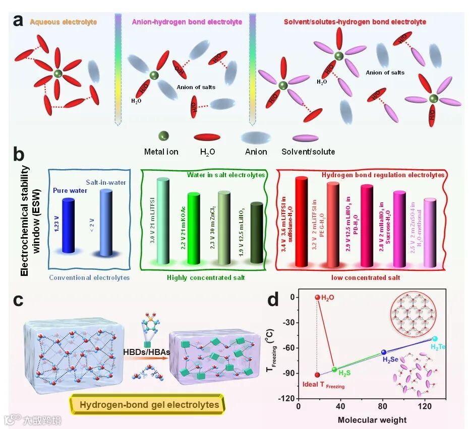 图7. HB化学对水裂解和凝固点的影响综述。(a)常规水电解质、阴离子拥挤和分子拥挤HB电解质的示意图比较。(b)常规电解质、盐包水电解质和低盐浓度HB电解质的ESW比较。(c) HB凝胶电解质示意图。(d) H2O、H2S、H2Se、H2Te的凝固点。插入的图片比较了不同HB环境下电解质在低温下的状态。