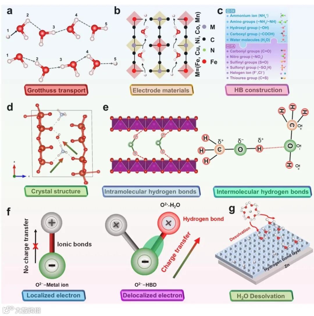 图5. HB在电极材料中的化学效应综述。(a)基于HB的Grotthuss机理及(b)相应在电极材料中的应用。(c)可选的HB构建单元(d) HB对晶体结构的影响。(e) HB对电极材料稳定性的影响。(f) HB对电子分布的影响。(g) HB对脱溶的影响