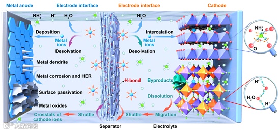 在电池系统中,隔膜被认为是必不可少的部件。它作为电解质的储存器,调节离子的运输,并产生物理分隔以防止短路。在水系电池中,隔膜通常由传统的多孔玻璃纤维(GF)、纤维素、聚酯非织造纤维、亲水系聚丙烯(PP)或Nafion材料制成。它不仅需要大量的电解液填充,而且大量不均匀的大孔、阴离子、活性H2O和H+离子会在金属阳极表面引起严重的枝晶和副反应。功能化隔膜中HB的研究仍处于初级阶段,但鉴于其巨大的潜在有效性,这并不妨碍我们提出深思熟虑的想法。隔膜作为电池必不可少的组成部分,在调节金属电极沉积过程或抑制H2/H2S逸出、H+相关金属阳极腐蚀、多硫化物穿梭效应等一系列副反应中发挥着重要作用。