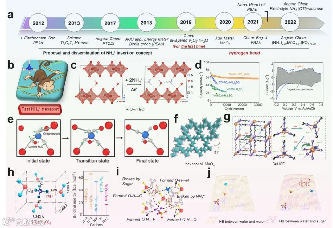 图4. HB化学对NH4+载体扩散和储存的影响综述。(a)铵离子电池发展时间表。(b) NH4+离子在电极材料内部扩散示意图。(c) NH4+离子插入后HB形成示意图。(d)基于NH4+离子插入的V2O5·nH2O电化学性能。(e)描述NH4+扩散机制的快照。(f)六方MoO3的结构。(g) NH4+在CuHCF中的扩散示意图。(h) NH4+离子的溶剂化结构及相应的脱溶能垒(i)相互作用示意图。