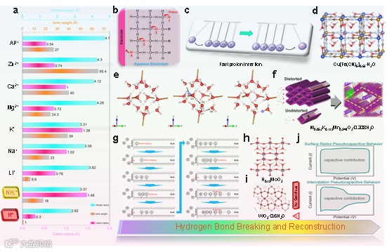 图3. 说明了HB化学对质子载体扩散和储存的影响。(a)对质子、铵离子和其他常见金属载体进行了比较。(b)示意图显示了水溶液中质子的快速传导。(c)牛顿摇架的原理图。(d)在特恩布尔的蓝色类似物中描绘HB。(e)密度泛函理论计算揭示了质子结合位点和转移路径。(f)结构畸变有利于MnO2中质子的快速转移。(g)说明了质子插入和扩散机制。(h)显示富质子H1.75MoO3中的HB网络。(i) WO3·0.6H2O的晶体结构单元。(j)比较了电容器和插入式伪电容的贡献。