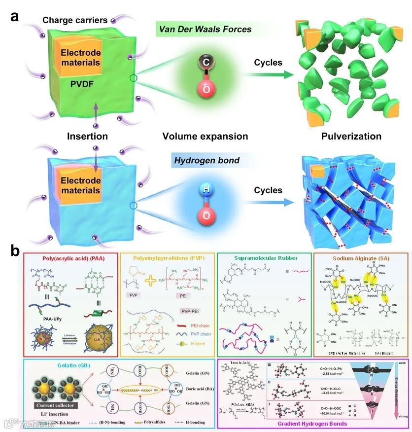 图9. HB对粘结剂的化学作用综述。(a) HB粘结剂抑制电极材料粉碎效果示意图。(b) PAA、PVP、SR、SA、GN和梯度粘结剂几种不同类型HB粘结剂的形成过程和作用机理。