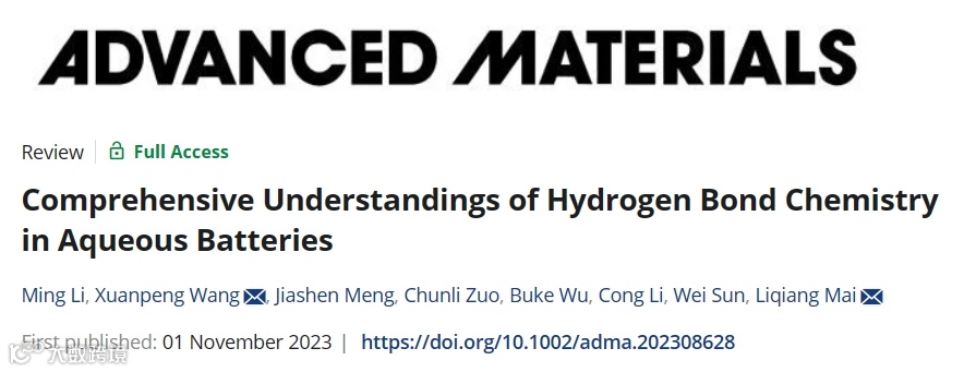 近日,武汉理工大学麦立强教授课题组在国际知名期刊Advanced Materials上发表题为“Comprehensive Understandings of Hydrogen Bond Chemistry in Aqueous Batteries”的综述文章。该观点文章基于HB化学从载流子、电极材料、粘结剂、电解液到隔膜全面地总结了在水系电池遇到的一系列关键问题如:自放电、电极材料的结构稳定性、粉碎、溶剂化结构、载流子扩散、腐蚀反应、pH敏感性、水分解、低温性能差、多硫化物穿梭等,巧妙地构建了新型HB化学与各种水电池之间的复杂联系。给出了基于HB化学的深刻的见解,旨在推动水系电池的发展。