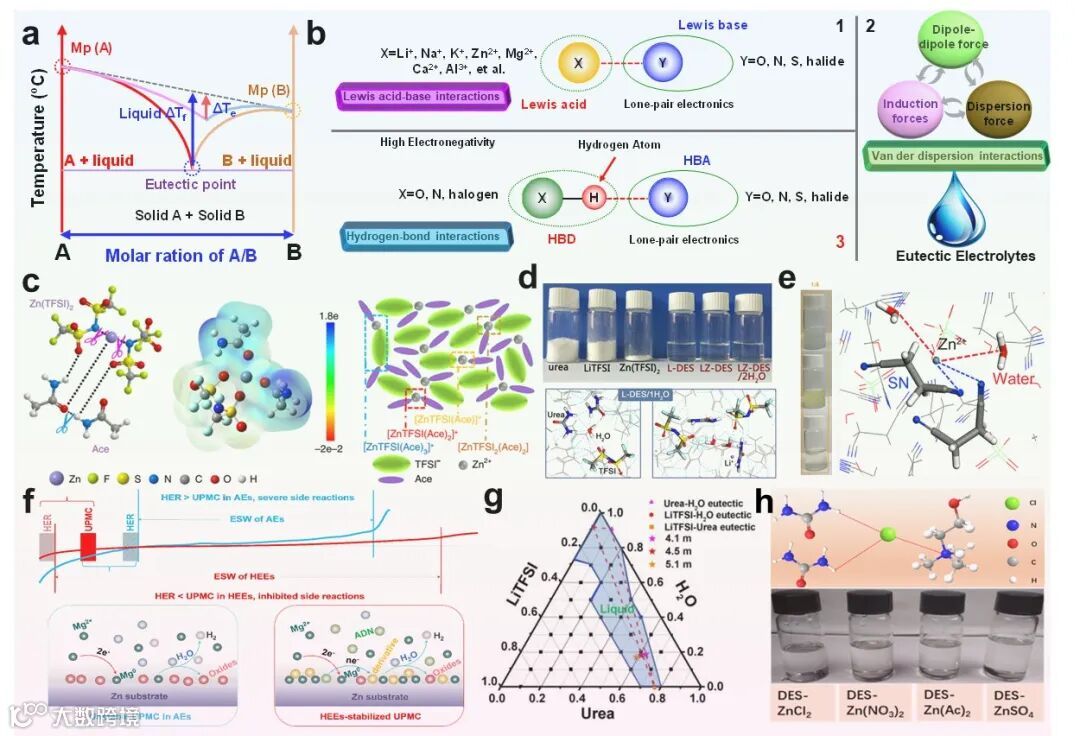 图8. HB化学对HB基DES电解质和金属阳极保护的影响综述。(a)双组分共晶电解质相图。(b)三种共晶电解质的形成机理。(c)锌离子电池用Ace−Zn(TFSI)2 DES电解质的溶剂化结构及形成机理示意图。(d) Zn/Li混合电池用CO(NH2)2−LiTFSI/Zn(TFSI)2 HDES电解质的制备及溶剂化结构。(e)锌离子电池用ZnSO4∙7H2O、Zn(NO3)2∙6H2O、Zn(ClO4)2∙6H2O/SN HDES电解质。(f)己二腈-Mg(ClO4)2·6H2O HDES示意图,缓解了HER与Mg离子电池镀/剥离Mg之间的竞争。(g)室温下尿素、LiTFSI、H2O三元相图中的液相区。(h)用于锌离子电池的ChCl−CO(NH2)2 HDES和相应的不同盐电解质示意图和照片。