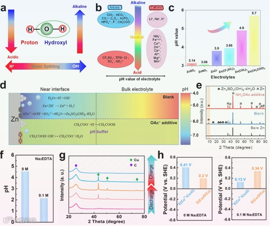 图6.HB对水解反应的化学影响综述。(a)水解示意图。(b)水解反应引起的电解质酸碱度差异。(c)各种锌离子电池电解质的pH值。(d)不同电解质的pH演化示意图及界面pH缓冲机理。(e)裸锌在不同电解质中浸泡7天的XRD图谱。(f)添加或不添加0.1 M Na2EDTA时电解质的pH变化。(g)镀Cu2+和剥离Cu2+的非原位XRD图谱。(h)无0.1 M Na2EDTA和添加0.1 M Na2EDTA的电解液中Cu2+/Cu2O和Cu2O/Cu的理论电极电势。