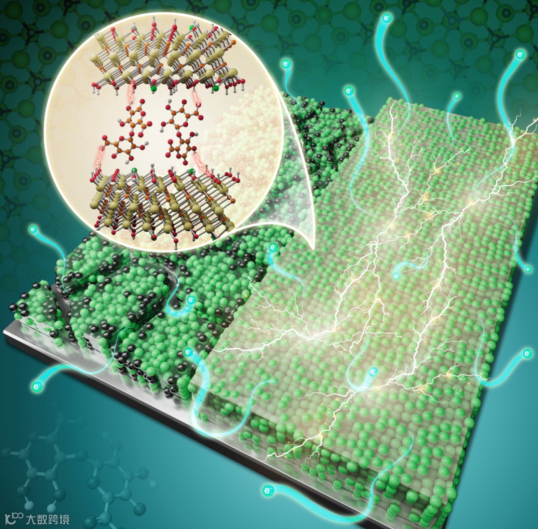 无导电助剂电极与传统电极对比,以及导电交联粘结剂的示意图。