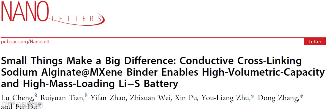 近日,来自吉林大学物理学院的杜菲教授、张冬教授与吉林大学化学学院的朱有亮教授合作,在国际知名期刊Nano Letters上发表题为“Small Things Make a Big Difference: Conductive Cross-Linking Sodium Alginate@MXene Binder Enables High-Volumetric-Capacity and High-Mass-Loading Li–S Battery”的研究文论。该论文针对电极中低占比的粘结剂展开功能化设计,开发出了一种导电交联粘结剂,并利用该粘结剂构建了无导电助剂电极,大幅提升了电极的体积比容量。