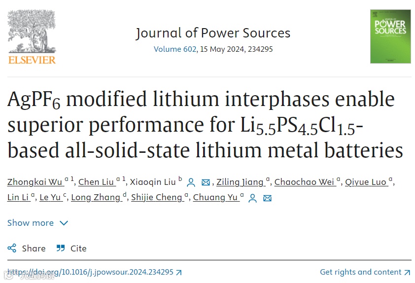 近期,华中科技大学余创教授团队在全固态锂金属电池方面取得进展,通过简单的热交换工艺实现了具备良好的锂兼容性的AgPF6改性负极并应用于全固态锂金属电池,同时探索了AgPF6和AgF俩种材料对负极改性的差别,总结出负极侧Ag的含量是影响材料负极稳定性的原因。相关成果以标题为“AgPF6modified lithium interphases enable superior performance for Li5.5PS4.5Cl1.5-based all-solid-state lithium metal batteries”发表在Journal of Power Sources。华中科技大学化学与化工学院博士研究生吴仲楷和博士后刘晨为论文第一作者。此研究得到国家自然科学基金等资助支持。