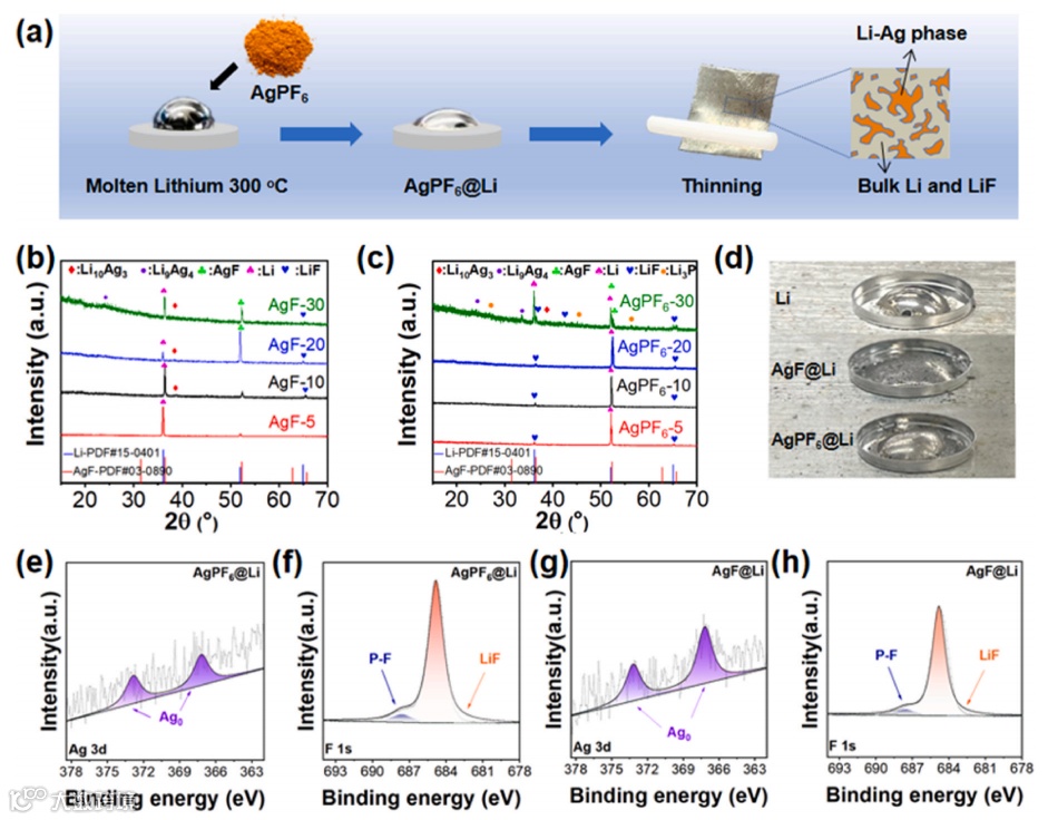 图1 (a) AgPF6和AgF的制备示意图; (b, c)AgPF6和AgF不同含量的XRD图像。(d)得到的AgPF6和AgF光学影像图;(e, f) AgPF6和(g, h)AgF的XPS图。