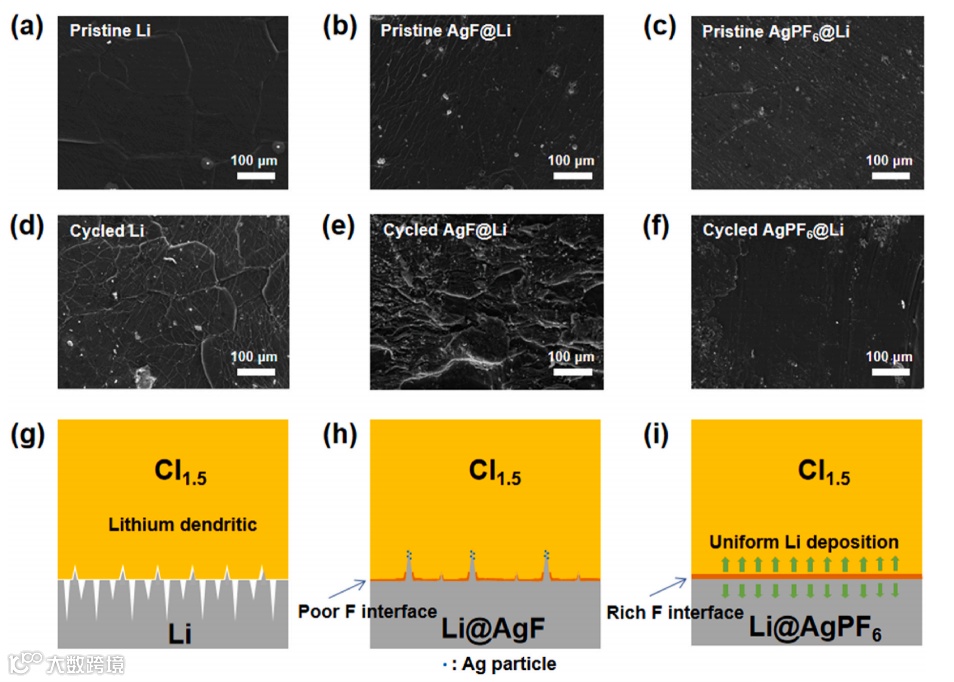 图3 使用(c, i)AgPF6,(b, e)AgF和(a, d)Li负极的锂金属电池循环前后相应的SEM图及机理图。