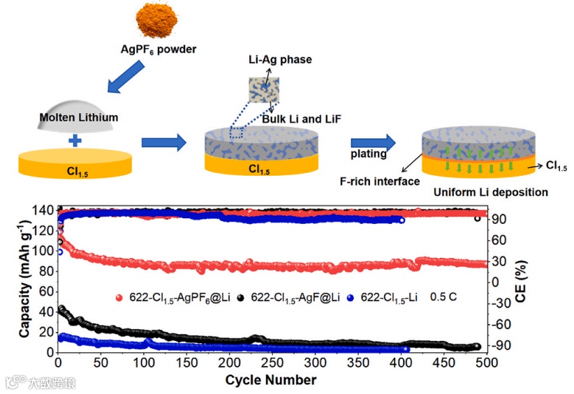 图1. 基于AgPF6改性的锂金属电池在界面处的稳定机理,及相应的电池长循环性能。