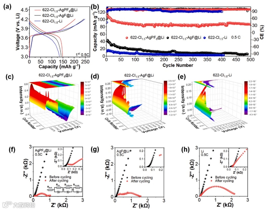 为了评估所获得的固体电解质在不同工作温度下的电化学性能,制备了由使用AgPF6@Li,AgF@Li和未经处理的锂金属的负极以及Li5.5PS4.5Cl1.5电解质组成的全固态锂金属电池。在0.5C条件下,组装好的AgPF6@Li电池、AgF@Li和未经处理的锂金属的首圈放电容量为113.5 mAhg−1、41.4 mAhg−1和14 mAhg−1。在循环过程中,观察到Li/Li5.5PS4.5Cl1.5/NCM622和AgF@Li/Li5.5PS4.5Cl1.5/NCM622电池在循环过程中放电容量的快速下降。相比之下,采用AgPF6@Li负极的电池表现出一致的循环行为,在500次循环后保持了显著更高的放电容量87.3 mAhg−1和更小的阻抗,在室温下的容量保持为77.0%。这些结果表明,AgPF6@Li阳极即使在0.5C下也具有优越的循环性,这可以归因于副反应的限制和锂枝晶在富F界面的缓慢生长动力学。