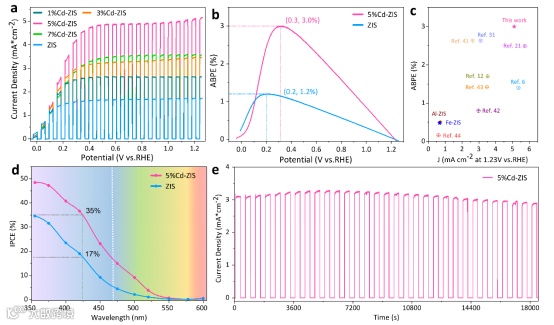 通过光电化学性能表征,进一步揭示替位Cd掺杂对ZnIn2S4性能的调控。光电流密度随Cd掺杂浓度从0%变至5%逐渐增大。这得益于在(001)基面的Zn-S终端引入替位掺杂Cd,协同调控能带结构和表面活性,优化光生载流子动力学过程,同步提升了光生载流子分离效率、表面光空穴注入效率,从而得到了具有优异光电转换效率(ABPE、IPCE)以及长时程循环稳定性的PEC光阳极。