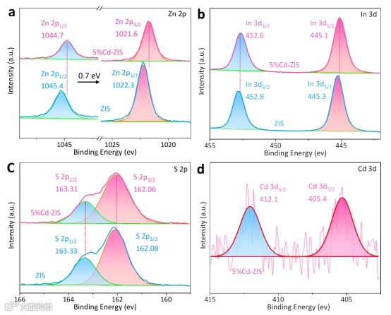 图3. ZnIn2S4和Cd-ZnIn2S4的XPS表征。
