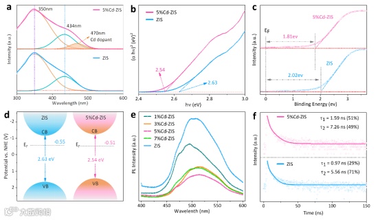 图4. ZnIn2S4和Cd-ZnIn2S4的能带结构和光生载流子分离效率表征。