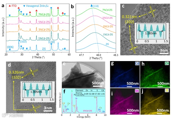 图2. ZnIn2S4和Cd-ZnIn2S4的微结构表征。