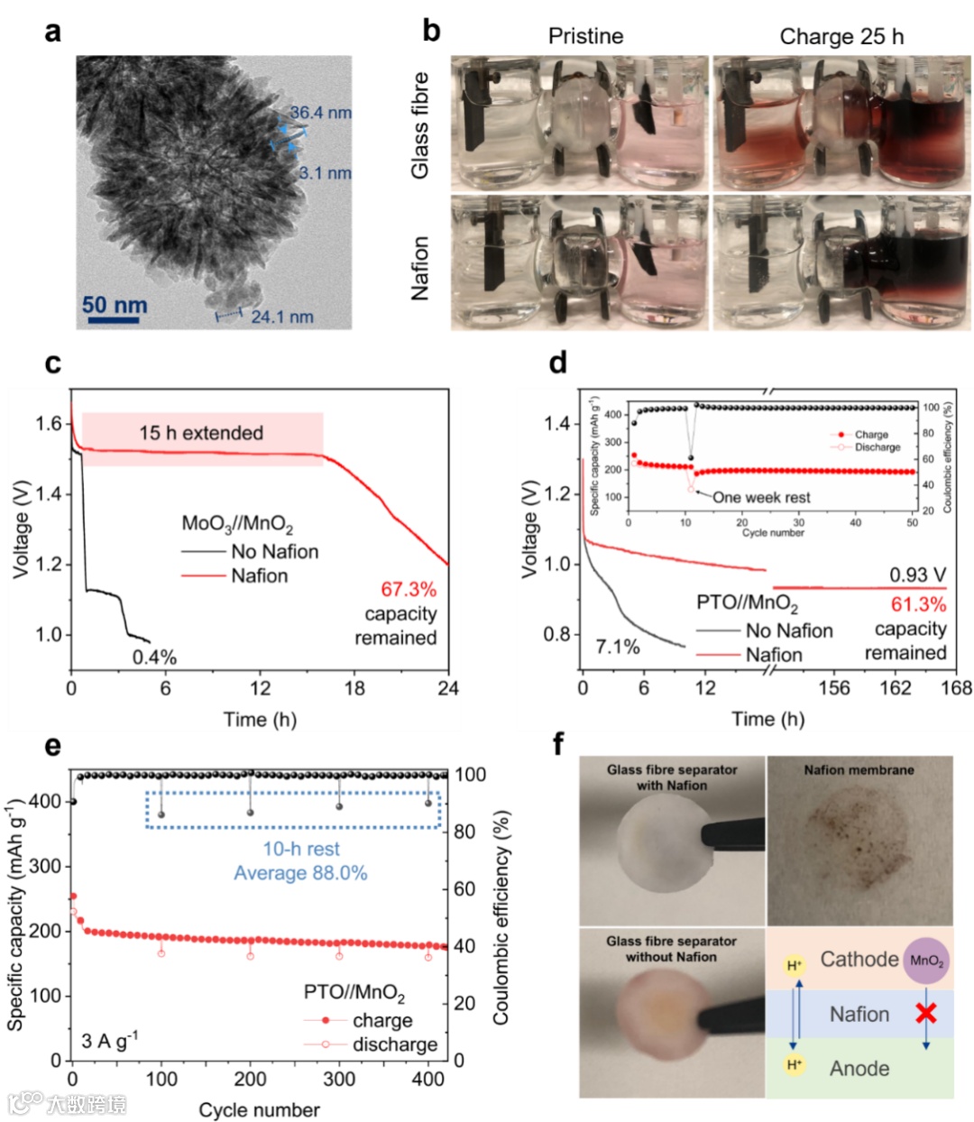 图3. Nafion隔膜对抑制MnO2 穿梭作用的研究。(a)从E2020胶体电解液中分离的MnO2颗粒的TEM图像。(b)H-cell中使用Nafion隔膜对MnO2穿梭的抑制。(c)MoO3//MnO2全电池和(d)PTO//MnO2全电池自放电测试的电压-时间曲线。(e)使用Nafion隔膜的PTO//MnO2全电池循环测试。(f)循环后的玻璃纤维隔膜和Nafion隔膜的照片。